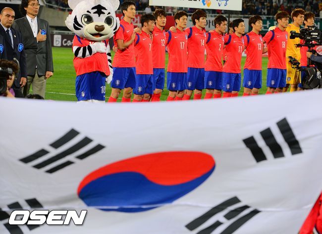 10일 오후 천안종합운동장에서 열린 한국과 파라과이의 평가전에 앞서 축구대표팀이 국민의례를 하고 있다