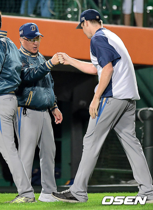 승리투수가 된 NC 찰리가 김경문 감독과 인사를 나누고 있다./dreamer@osen.co.kr