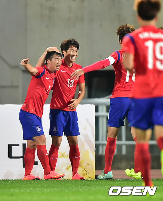 10일 오후 천안종합운동장에서 열린 한국과 파라과이의 평가전, 전반 김민우가 선취골을 넣고 환호하고 있다.