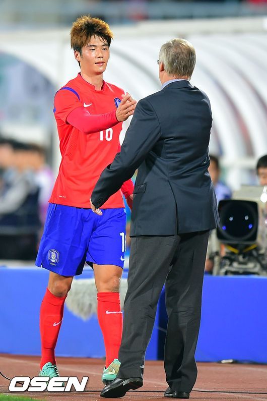 10일 오후 천안종합운동장에서 열린 한국과 파라과이의 평가전, 후반 교체된 기성용이 슈틸리케 감독과 포옹을 하고 있다.