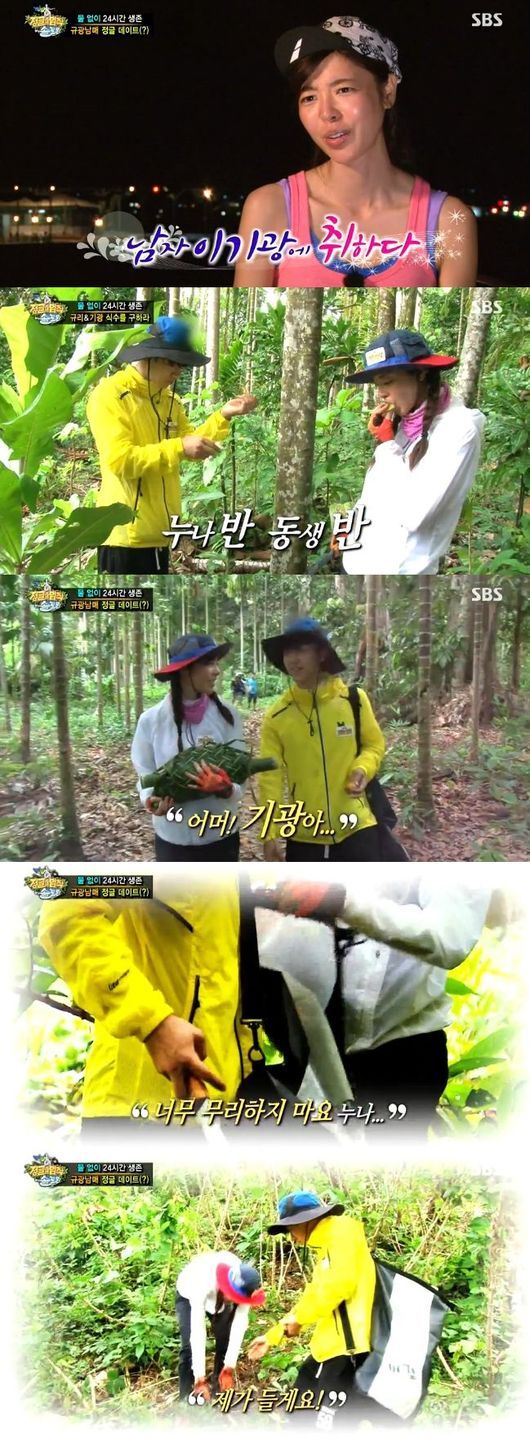 이기광은 김규리와 짝을 이뤄 과일을 채집하던 중 "정글에서 데이트하는 기분이다"라고 달콤한 말을 건넸고, 이에 김규리는 "어머 기광아"라며 함박 미소를 보였다.
