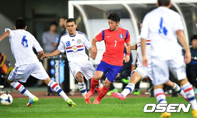 10일 오후 천안종합운동장에서 열린 한국과 파라과이의 평가전, 한국 김민우가 수비를 피해 옆으로 패스를 하고 있다.