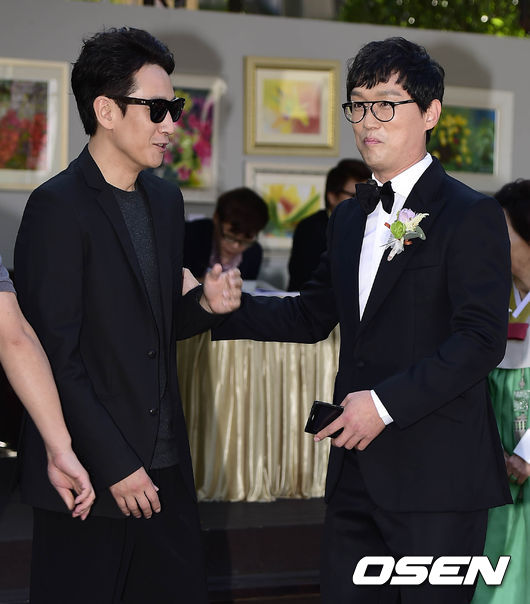 신랑 고명환과 배우 이선균이 이야기를 나누고 있다.