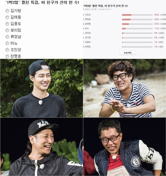 '자체발광’ 조인성이 30%로 1위인 가운데, 몸을 사리지 않는 활약으로 시선강탈하며 ‘예능원석’으로 거듭난 류정남이 28%를 차지하며 약 100표라는 근소한 차이로 조인성을 바짝 추격하고 있다. 무엇보다 범상치 않은 예능감을 폭발시킨 류정남에 대해 “조인성 나온다고 해서 보고 류정남 때문에 배꼽 잡았다”, “류정남 자장면 먹는 거 보고1년 웃을 거 다 웃었네”라며 환호가 쏟아지고 있는 상황.