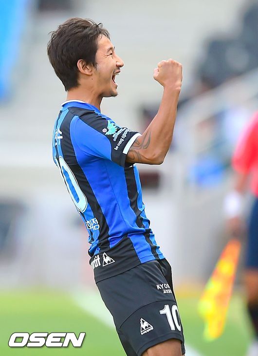 11일 오후 인천전용축구장에서 열린 현대오일뱅크 K리그 클래식 2014 인천과 포항의 경기, 전반 인천 이천수가 프리킥으로 선취골을 넣고 환호하고 있다.