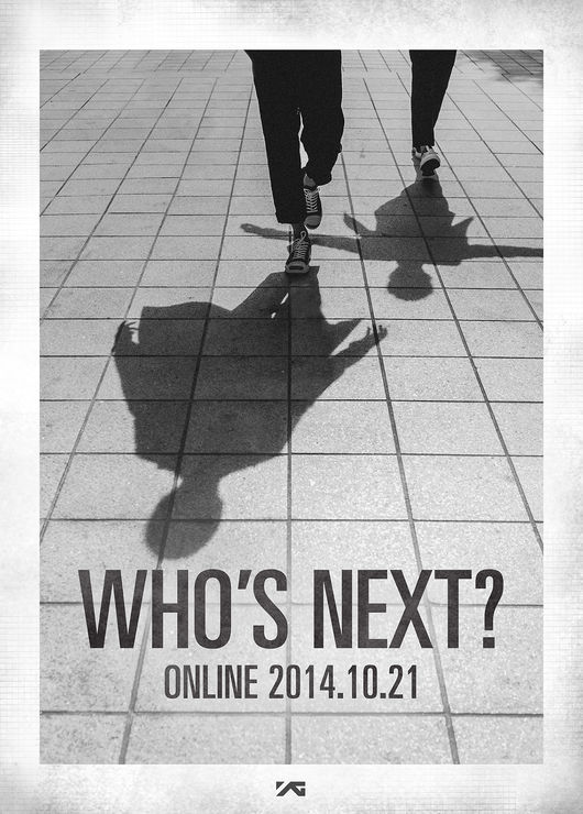 YG는 11일 오후 2시 YG공식블로그(www.yg-life.com)를 통해 ‘WHO IS NEXT’라는 문구가 적힌 티저를 공개했다. 거리를 걷는 두 사람과 이들의 그림자가 인상적인 티저 이미지에는 YG가 지난 8일 공개한 티저와 마찬가지로‘2014.10.21’이라는 구체적인 날짜와 시간이 명시돼 있어 기대감을 높이고 있다.