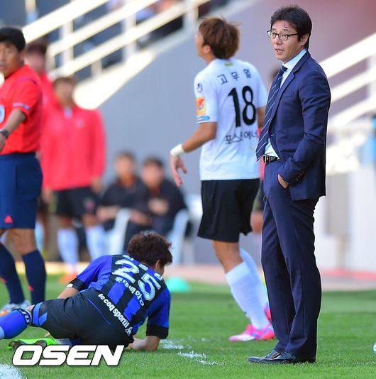 11일 오후 인천전용축구장에서 열린 현대오일뱅크 K리그 클래식 2014 인천과 포항의 경기, 후반 포항 황선홍 감독이 경기가 안풀리자 아쉬운 표정을 짓고 있다.