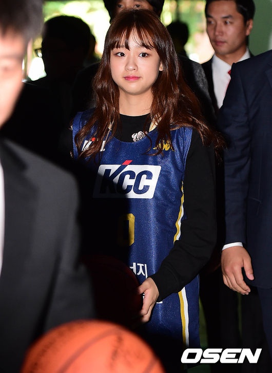 체조 요정 손연재가 시구를 위해 코트로 들어서고 있다.