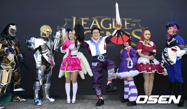 경기시작전 코스튬 행사로 권이슬 아나운서와 전병헌 e스포츠 회장, Team CSL이 게임 속 캐릭터로 분해 포토타임을 갖고 있다.