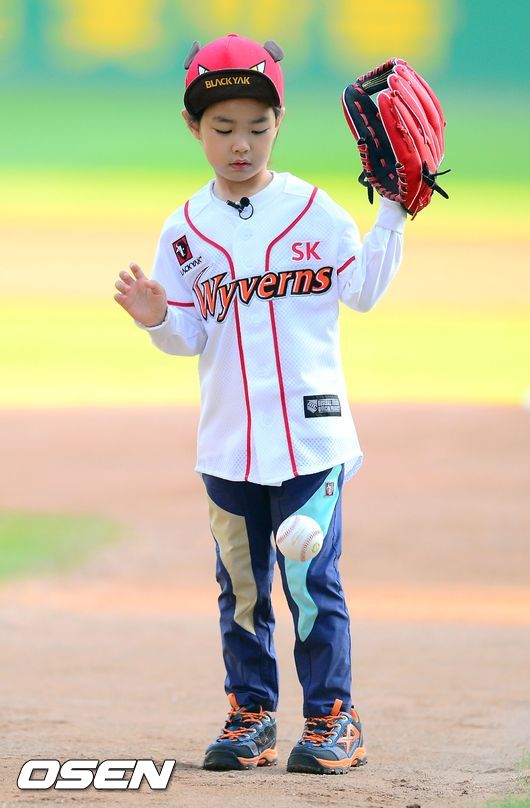 11일 오후 인천 문학구장에서 열린 2014 한국야쿠르트 세븐 프로야구 SK 와이번스와 넥센 히어로즈의 경기전 시구 나선 하루가 공을 떨어뜨리고 있다.