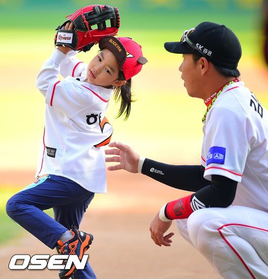11일 오후 인천 문학구장에서 열린 2014 한국야쿠르트 세븐 프로야구 SK 와이번스와 넥센 히어로즈의 경기전 시구 나선 하루가 SK 김강민의 지도를 받고 있다.