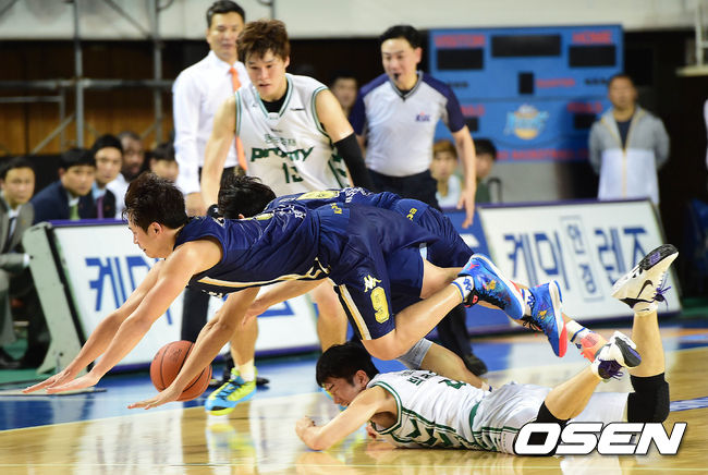 4쿼터, KCC 정민수와 박경상, 동부 박병우가 루즈볼 다툼 중 함께 넘어지고 있다.
