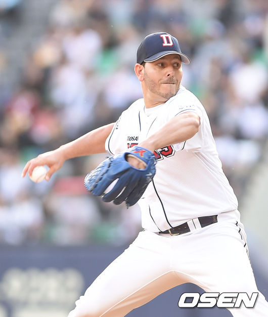 11일 오후 잠실야구장에서 열린 '2014 한국야쿠르트 세븐 프로야구' 두산 베어스와 LG 트읜스의 경기,두산 선발 마야가 공을 뿌리고 있다.