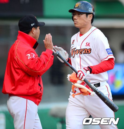 11일 오후 인천 문학구장에서 열린 2014 한국야쿠르트 세븐 프로야구 SK 와이번스와 넥센 히어로즈의 경기, 1회말 2사 1루 SK 박정권이 선취 2점 홈런을 날리고 이만수 감독과 하이파이브를 하고 있다.