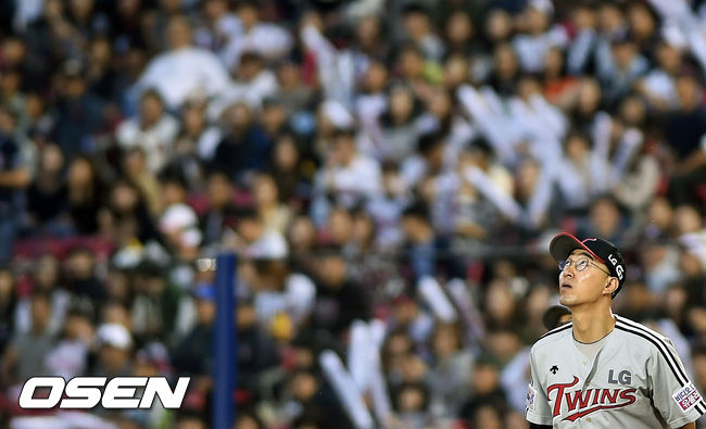 11일 오후 잠실야구장에서 열린 '2014 한국야쿠르트 세븐 프로야구' 두산 베어스와 LG 트읜스의 경기,3회말 2사 1루 김현수의 선재 투런홈런때 LG 정성훈 1루수가 타구를 바라보고 있다.
