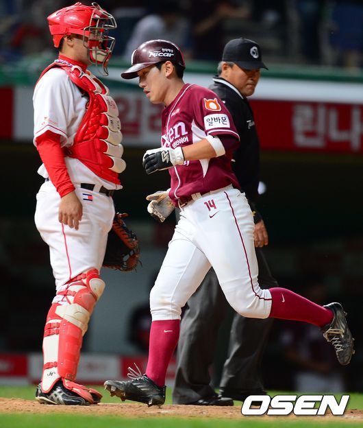 11일 오후 인천 문학구장에서 열린 2014 한국야쿠르트 세븐 프로야구 SK 와이번스와 넥센 히어로즈의 경기, 5회초 무사 3루 넥센 로티노의 안타때 3루 주자 서건창이 득점을 올리고 있다. 이번 득점으로 서건창은 시즌 128득점으로 1999년 이승엽(삼성)이 세운 단일 시즌 최다 득점(128점)과 타이를 기록했다.