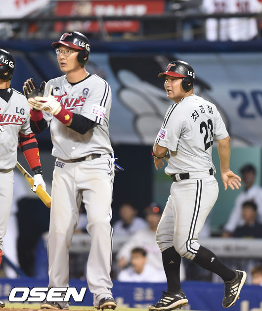 11일 오후 잠실야구장에서 열린 '2014 한국야쿠르트 세븐 프로야구' 두산 베어스와 LG 트읜스의 경기,4회초 1사 만루 정성훈의 2타점 역전 적시타때 손주인 최경철이 득점을 올리며 환호하고 있다.
