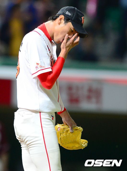 11일 오후 인천 문학구장에서 열린 2014 한국야쿠르트 세븐 프로야구 SK 와이번스와 넥센 히어로즈의 경기,5회초 1사 만루 넥센 김민성에게 동점 1타점 적시타를 허용한 SK 김광현 선발투수가 아쉬워하고 있다.