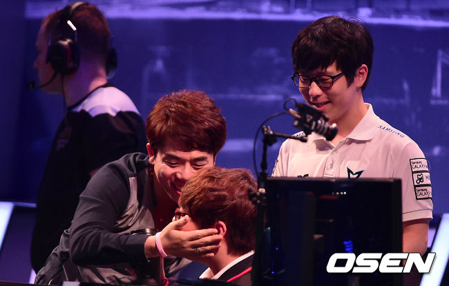 삼성 화이트의 2연승 후 삼성 화이트 코치 윤성영이 폰 허원석의 볼을 쓰다듬고 있다.