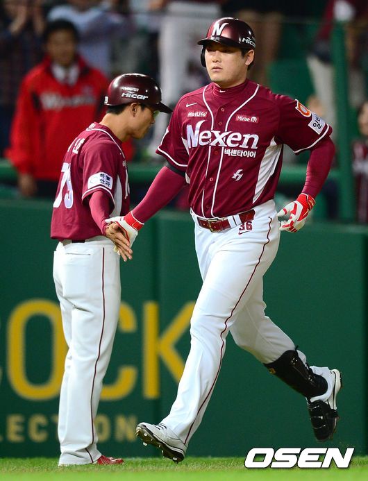 11일 오후 인천 문학구장에서 열린 2014 한국야쿠르트 세븐 프로야구 SK 와이번스와 넥센 히어로즈의 경기,8회초 1사 넥센 이성열이 역전 솔로홈런을 날리고 베이스를 돌고 있다.