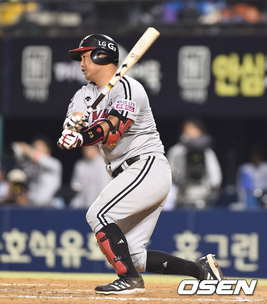 11일 오후 잠실야구장에서 열린 '2014 한국야쿠르트 세븐 프로야구' 두산 베어스와 LG 트읜스의 경기,8회초 1사 3루 최경철 1타점 적시타를 날리고 있다.