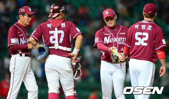 11일 오후 인천 문학구장에서 열린 2014 한국야쿠르트 세븐 프로야구 SK 와이번스와 넥센 히어로즈의 경기,8회말 무사 만루 넥센 한현희 투수가 강판되고 있다.