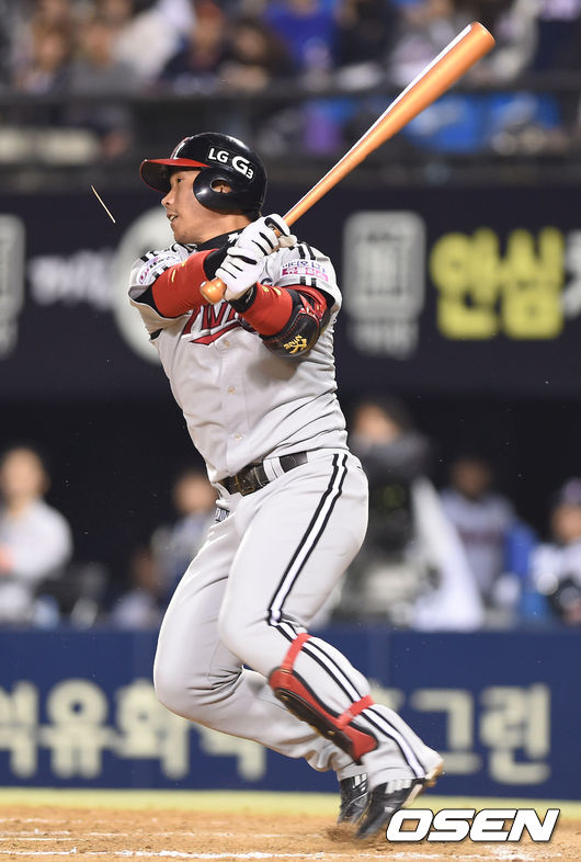 11일 오후 잠실야구장에서 열린 '2014 한국야쿠르트 세븐 프로야구' 두산 베어스와 LG 트읜스의 경기,8회초 1사 만루 박경수 2타점 적시타를 날리고 있다.