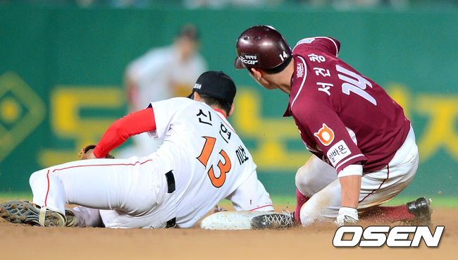 11일 오후 인천 문학구장에서 열린 2014 한국야쿠르트 세븐 프로야구 SK 와이번스와 넥센 히어로즈의 경기,연장 10회초 1사 1루 넥센 서건창이 도루성공하고 있다.
