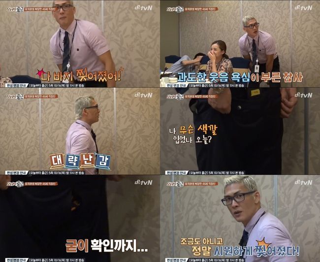 박준형은 11일 오후 방송된 tvN '오늘부터 출근'에서 회사 동료들을 웃겨주려다 바지가 찢어져 웃음을 자아냈다.