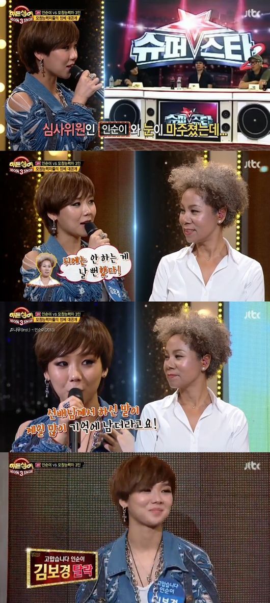 3라운드 미션곡은 '친구여'였다. 김보경은 '고맙습니다 인순이'로 등장했다. 김보경은 "'슈퍼스타K' 3차 예심 오디션에서 인순이 선생님이 심사위원으로 나왔다. 그런데 찝찝하게 붙여줬다"고 말문을 열었다.