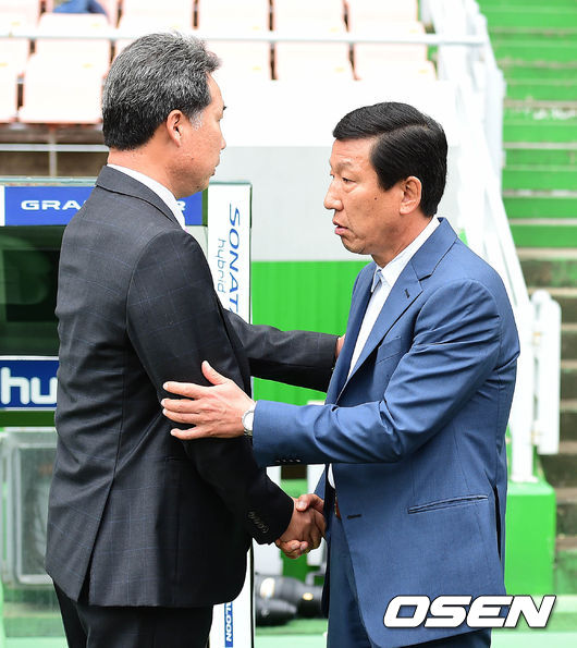경기 시작을 앞두고 전북 최강희 감독과 울산 조민국 감독이 인사를 나누하고 있다.