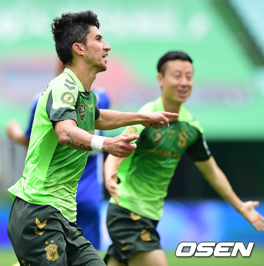 후반 전북 카이오가 선제 헤딩골을 작렬시킨 뒤 환호하고 있다.