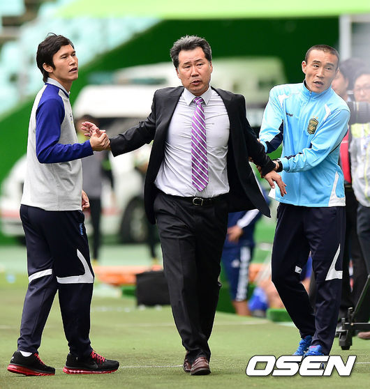 경기 종료 후 화가 난 울산 조민국 감독이 전북 벤치로 향하자 전북 박충균-최은성 코치가 말리고 있다. 조민국 감독은 경기 후 가진 인터뷰에서 전북의 미드필더 레오나르도가 후반 초반 한재웅의 충돌 상황에서 레오나르도가 울산 벤치를 향해 욕설을 뱉었다고 말했다./dreamer@osen.co.kr