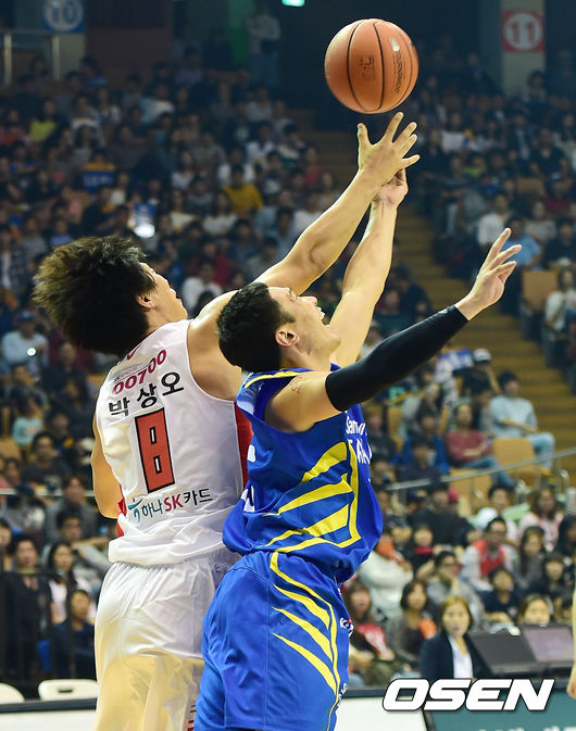 2쿼터, SK 박상오와 삼성 이정석이 리바운드를 다투고 있다.
