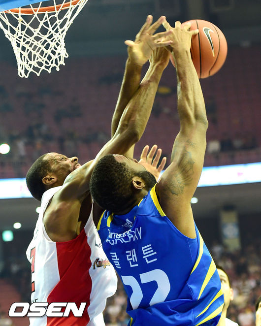3쿼터, SK 헤인즈와 삼성 클랜튼이 리바운드를 다투고 있다.