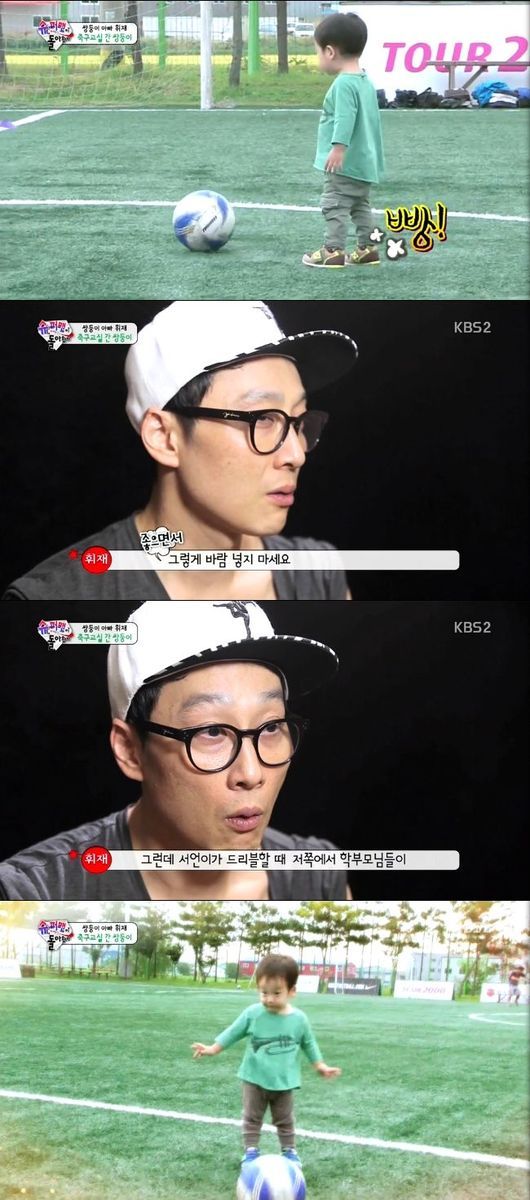 이휘재는 12일 오후 방송된 KBS 2TV 예능 프로그램 '해피선데이-슈퍼맨이 돌아왔다'(이하 '슈퍼맨이 돌아왔다')에서 서언-서준이와 박지성의 축구교실을 다녀온 후 "서언이가 좀 차더라"는 제작진의 말에 "바람 넣지 마라"고 말했다.