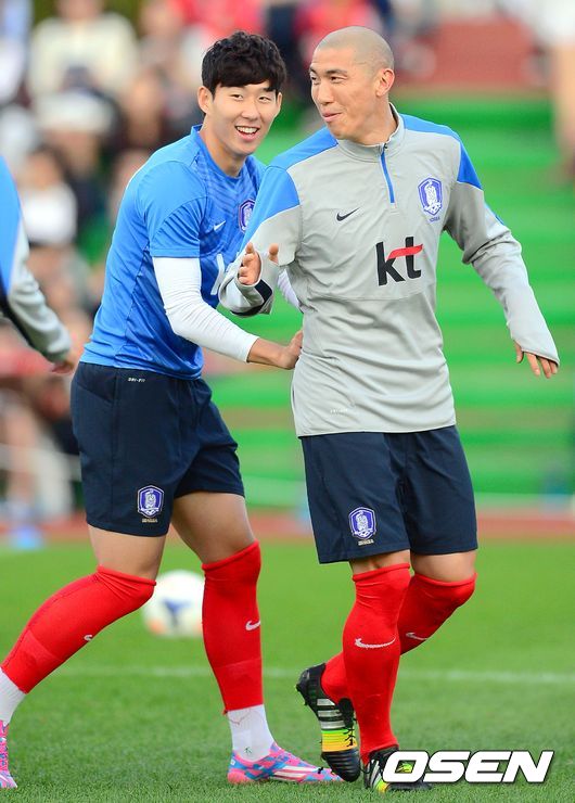 12일 오후 경기도 파주시 NFC훈련장에서 열린 축구대표팀의 공식훈련, 수많은 축구팬들 앞에서 차두리와 손흥민이 즐겁게 훈련하고 있다.