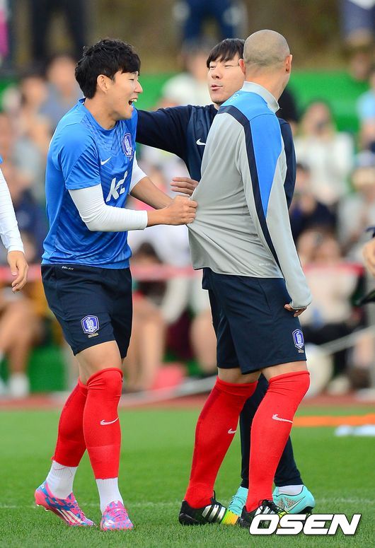 12일 오후 경기도 파주시 NFC훈련장에서 열린 축구대표팀의 공식훈련, 수많은 축구팬들 앞에서 손흥민이 신태용 코치에게 꿀밤을 맞고 있다.