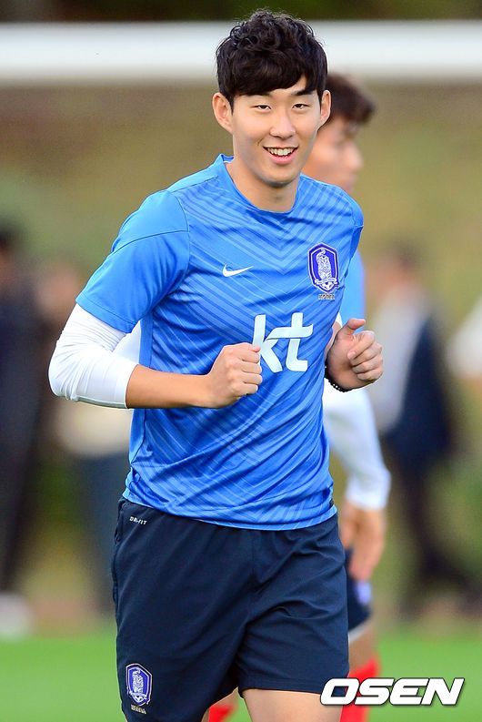 12일 오후 경기도 파주시 NFC훈련장에서 열린 축구대표팀의 공식훈련,손흥민이 미소 짓고 있다.