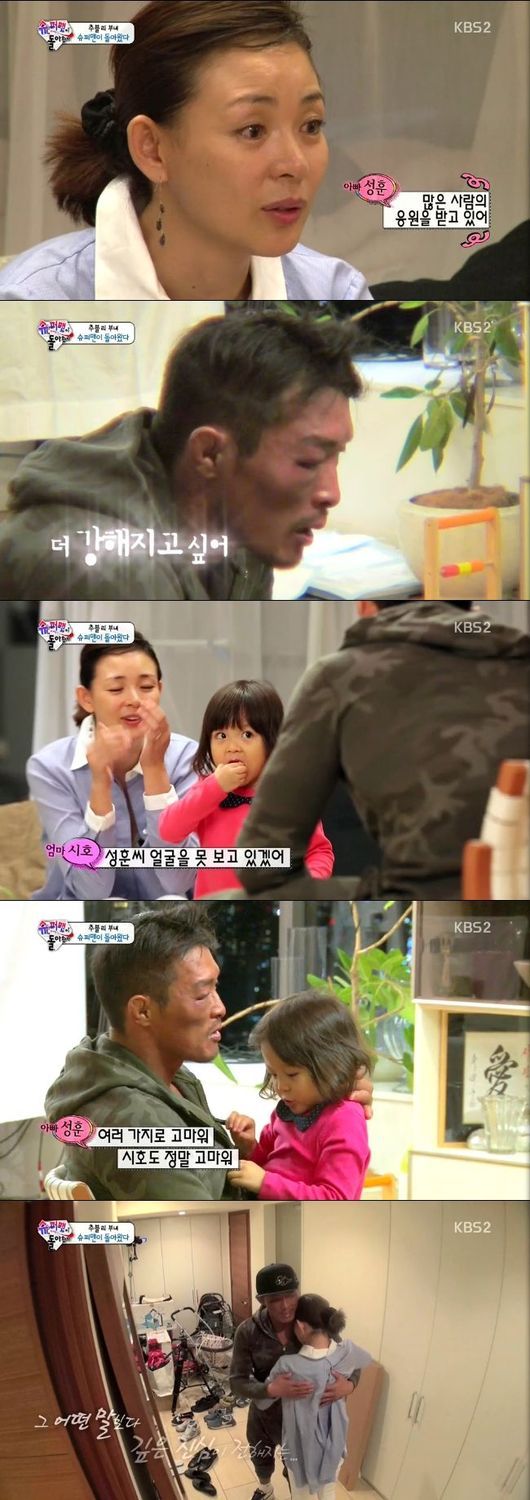 추성훈은 12일 오후 방송된 KBS 2TV 예능 프로그램 '해피선데이-슈퍼맨이 돌아왔다'(이하 '슈퍼맨이 돌아왔다')에서 2년 8개월만의 UFC 복귀전을 마치고 집으로 돌아와 아내 야노 시호와 딸 사랑이의 환영을 받았다.