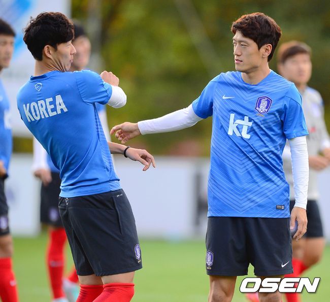 12일 오후 경기도 파주시 NFC훈련장에서 열린 축구대표팀의 공식훈련, 손흥민과 이청용이 장난을 치고 있다.