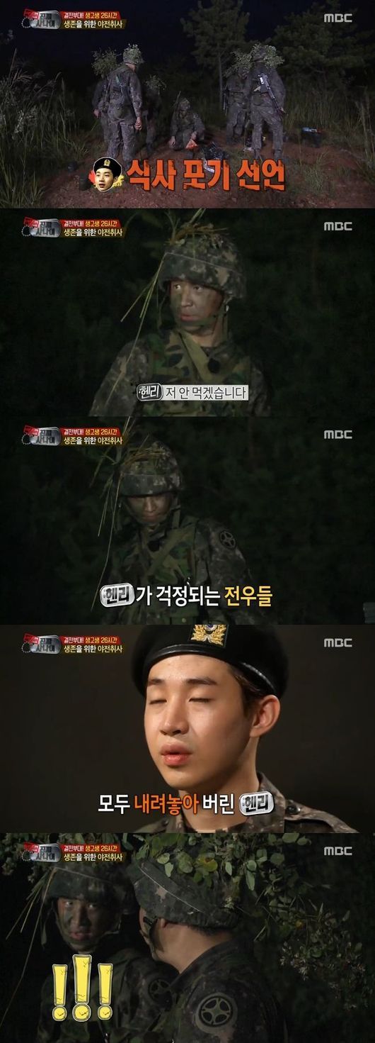 12일 오후 6시 15분 방송된 MBC '일밤-진짜 사나이'에는 헨리가 연이은 훈련 뒤에 요리까지 불을 지펴 해 먹어야 하는 상황이 오자 "그냥 먹지 않겠다"고 말하는 장면이 담겼다.