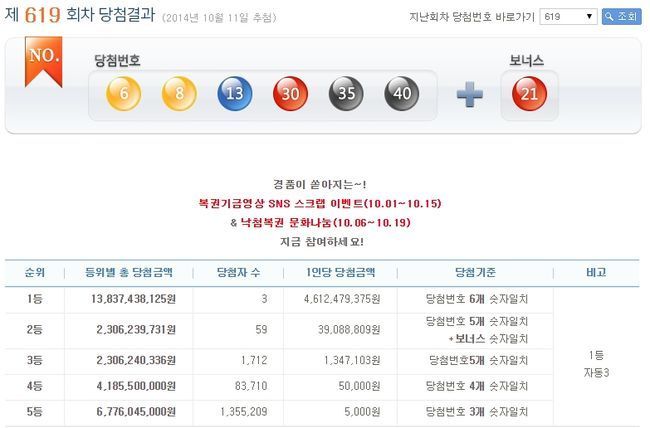 11일 나눔로또에 의하면 619회 로또 당첨번호가 6, 8, 13, 30, 35, 40 보너스번호 21로 정해졌다.