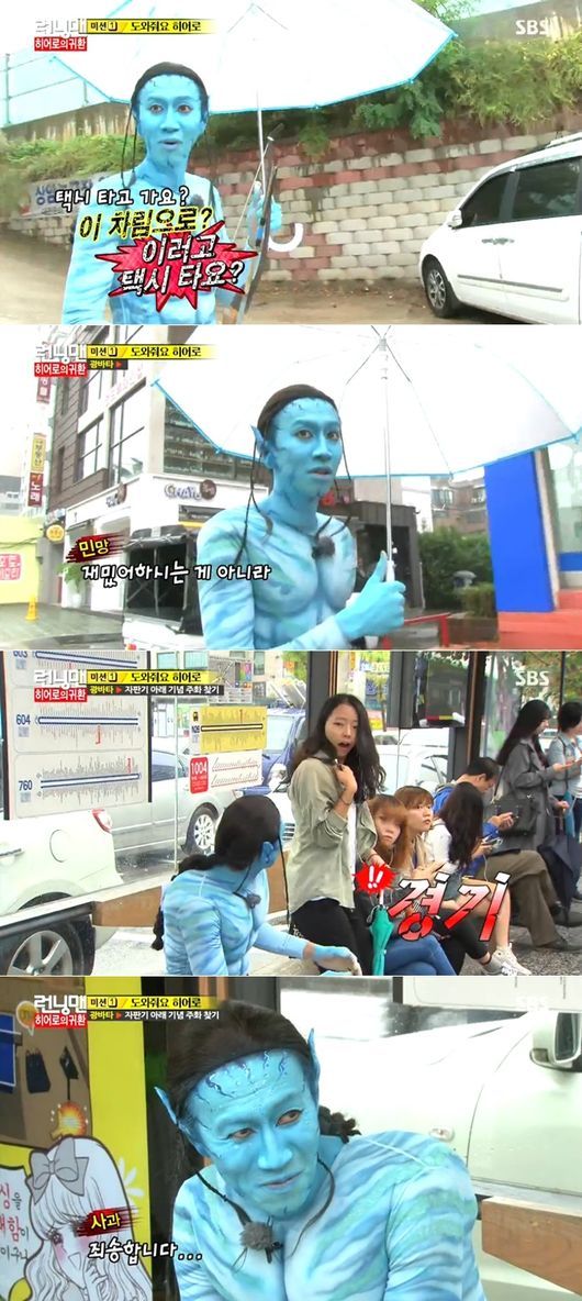 ‘런닝맨’ 이광수가 영화 ‘아바타’의 나비족 분장을 하고 길거리를 활보해 놀라는 시민들에게 미안해 했다.