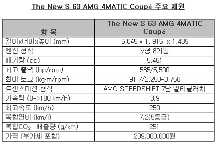 메르세데스-벤츠 The New S-Class Coupé는 국내에는 AMG 고성능 엔진에 메르세데스-벤츠 사륜구동 방식을 적용한 The New S 63 AMG 4MATIC Coupé 모델로 출시된다.