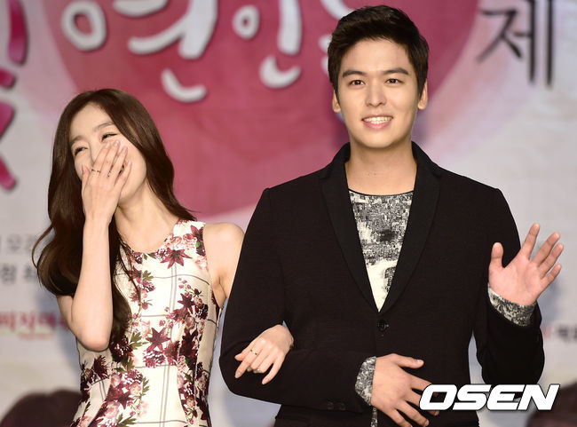 13일 서울 마포구 상암동 MBC 골든마우스 홀에서 열린 새 주말 드라마 '장미빛 연인들' 제작발표회에서 배우 한선화와 이장우가 포토타임을 갖고 있다.