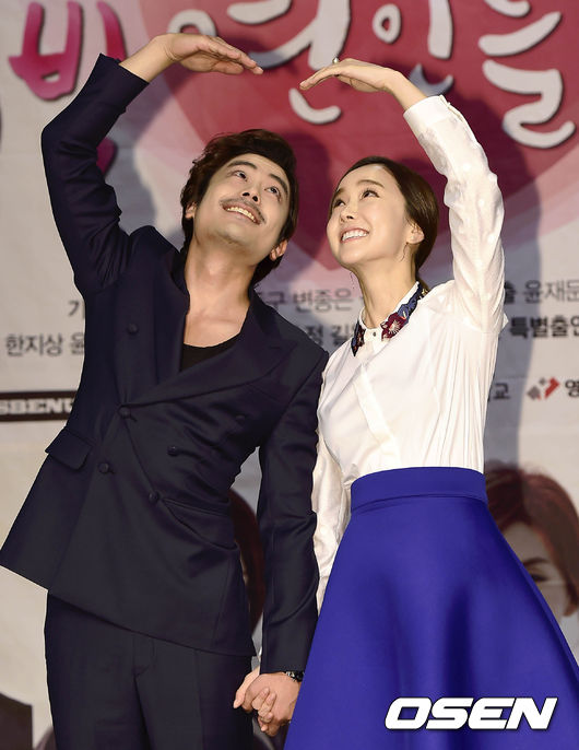 13일 서울 마포구 상암동 MBC 골든마우스 홀에서 열린 새 주말 드라마 '장미빛 연인들' 제작발표회에서 배우 한지상과 김민서가 포토타임을 갖고 있다.