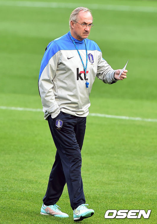 슈틸리케 감독이 메모지를 들고 훈련에 참가하고 있다.