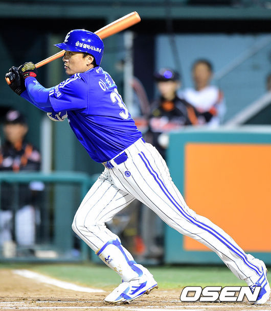 1회초 삼성 공격 1사 주자 없는 상황 이승엽이 우전안타를 날리고 있다. 프로 통산 1700 안타.