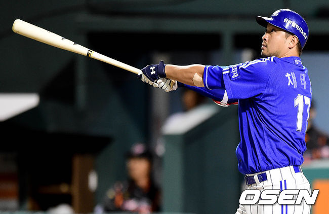 1회초 삼성 공격 1사 1루 상황 채태인이 선제 좌중간 투런포를 날리고 타구를 바라보고 있다.